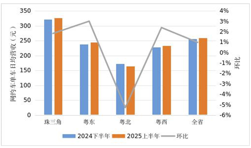 4.本统计期内,全省日均订单≥10单的网约出租车中,单车日均营收约259.19元,较2024年下半年增长0.98%,其中,珠三角地区单车日均营收约327.27元,较2024年下半年增长1.83%;粤东地区单车日均营收约245.10元,较2024年下半年增长3.01%;粤西地区单车日均营收约233.24元,6较2024年下半年增长2.40%;粤北地区单车日均营收约163.49元,较2024年下半年下降5.28%。