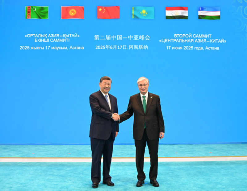 当地时间6月17日下午,第二届中国-中亚峰会在阿斯塔纳独立宫举行。哈萨克斯坦总统托卡耶夫主持会议。中国国家主席习近平、吉尔吉斯斯坦总统扎帕罗夫、塔吉克斯坦总统拉赫蒙、土库曼斯坦总统别尔德穆哈梅多夫、乌兹别克斯坦总统米尔济约耶夫出席。这是习近平同托卡耶夫握手。新华社记者 谢环驰 摄