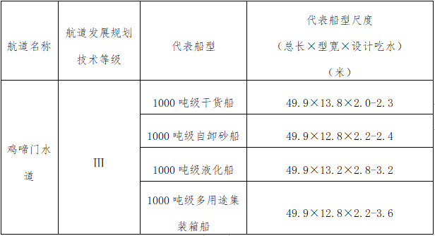 根据《广东省航道发展规划(2020-2035年)》及其他相关文件,工程所处鸡啼门水道河段的航道发展规划技术等级为Ⅲ级,圣师冲、禾丰冲、五福冲、正冲河段的航道发展规划技术等级为Ⅷ级。《华发水郡省级湿地公园二期工程(黄杨河湿地公园二期工程)航道通航条件影响评价报告》(以下简称《航评报告》)论证选用的代表船型合理,详见表1。