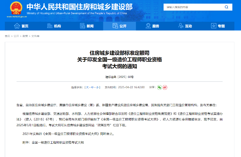 近日,住房城乡建设部标准定额司以建标造函〔2025〕60号文正式印发《全国一级造价工程师职业资格考试大纲》。该大纲依据住房城乡建设部、交通运输部、水利部、人力资源社会保障部联合印发的《造价工程师职业资格制度规定》和《造价工程师职业资格考试实施办法》(建人〔2018〕67 号)编制而成,经人力资源社会保障部审定后印发,于2025年5月1日起正式施行。2021年实施的《全国一级造价工程师职业资格考试大纲》同时废止。